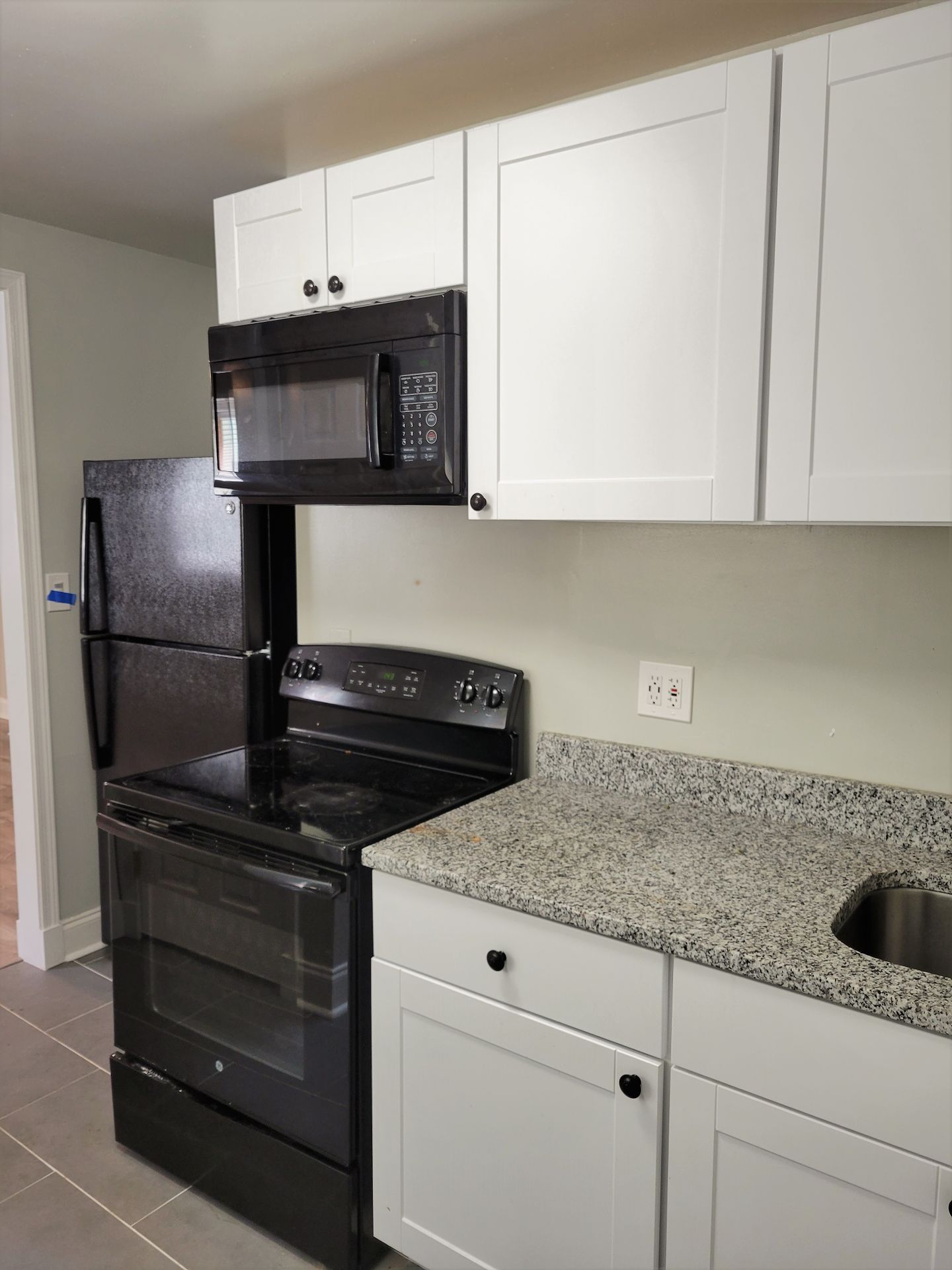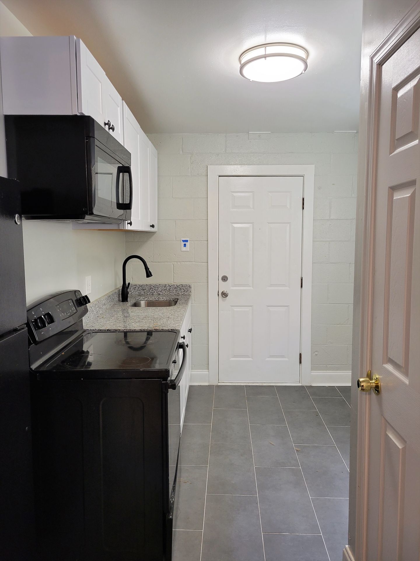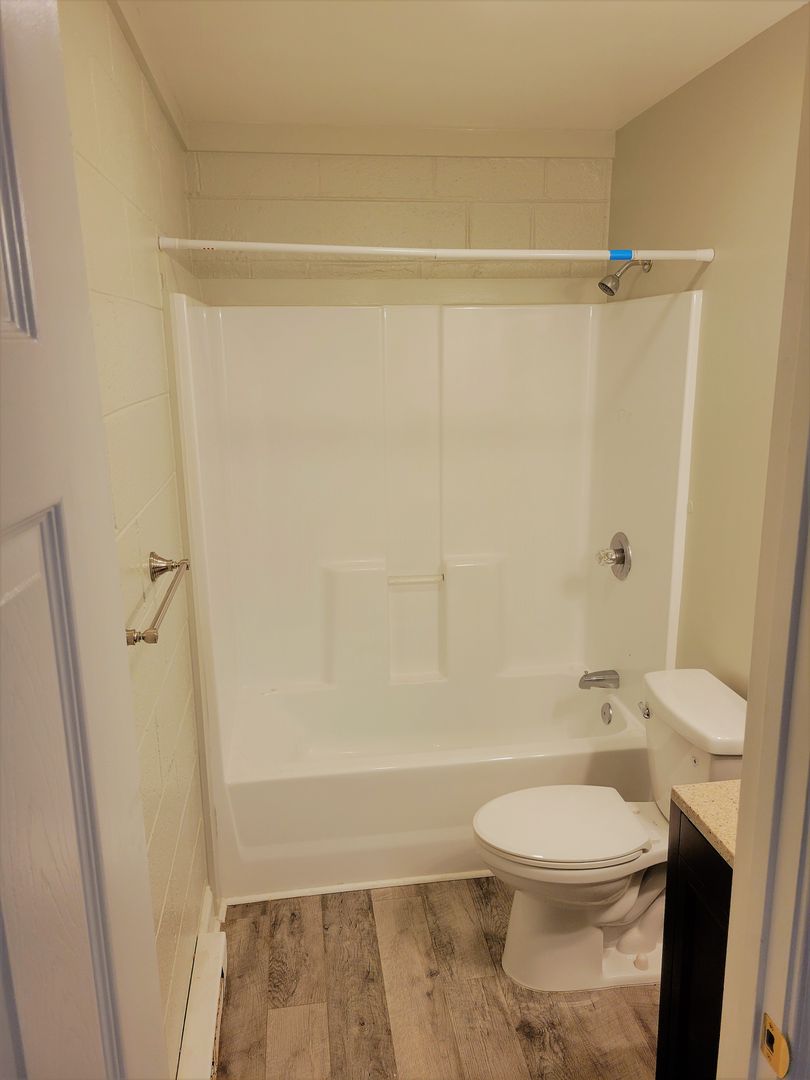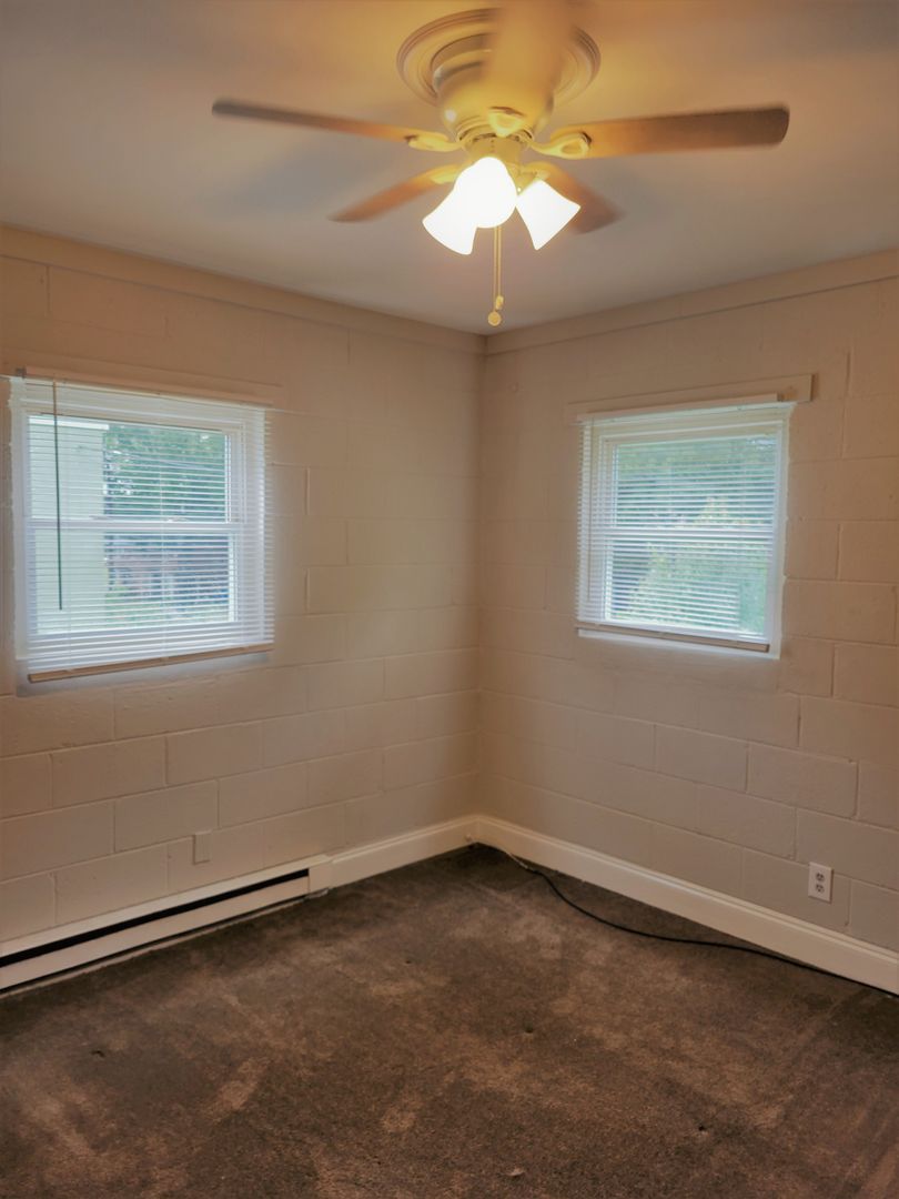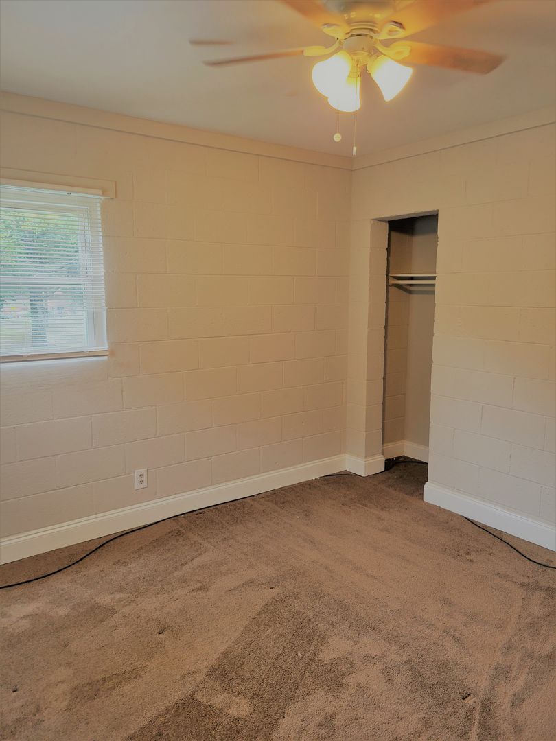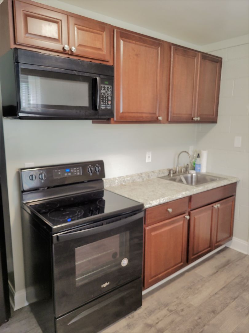 Renovated studio apartment with vinyl flooring and newer carpet, newer kitchen cabinets, granite countertops, stainless steel appliances, vinyl replacement windows, renovated bathroom, and fenced in community back yard.